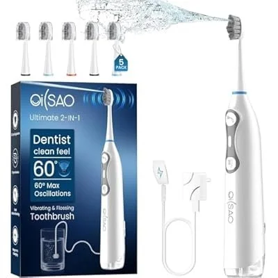 3-in-1 Upgraded Pro Flossing Toothbrush-Flosses, Vibrates and Oscillates(The 1st Tech), Electric Toothbrush with Water Flosser Equipe 5 Brush Heads, Plaque Removal for Sensitivity, Braces-White