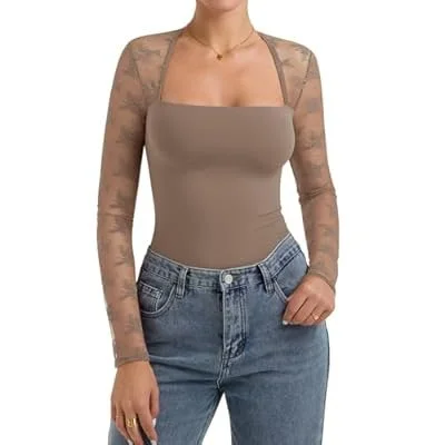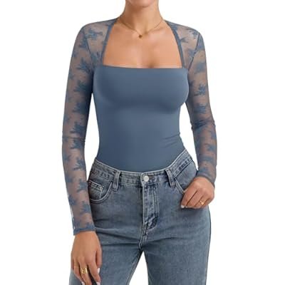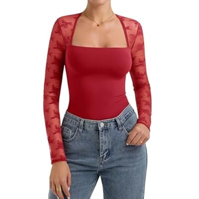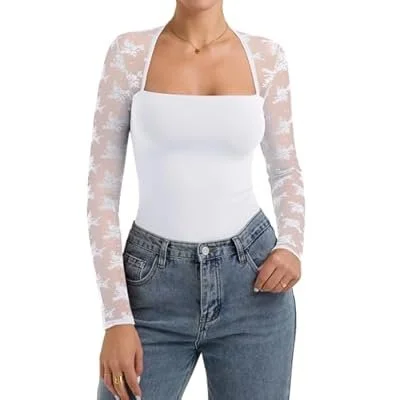 PINKMSTYLE Women Sexy Square Neck Lace Long Sleeve Tops Slim Fit Double Lined Trendy Y2K Going Out Fall Shirts