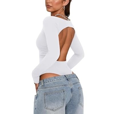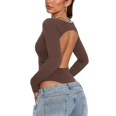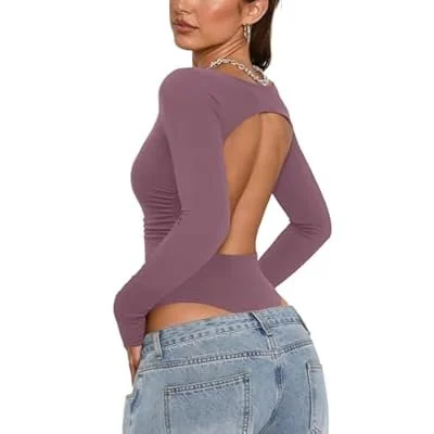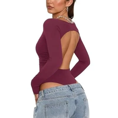 PINKMSTYLE Women Open Back Long Sleeve Bodysuit Boat Neck Double Lined Tops Slim Fit Ruched Backless Going Out Y2K Body Suit