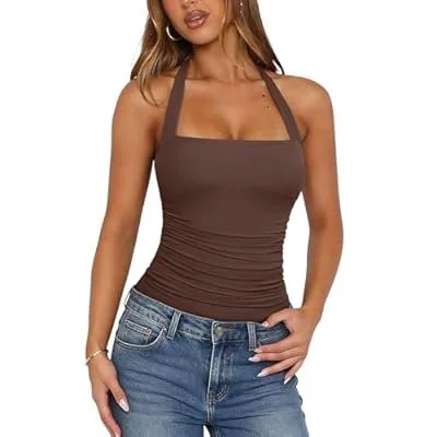 PINKMSTYLE Halter Square Neck Bodysuits for Women Mesh Sleeveless Thong Body Suits Tank Tops Double Lined Fitted Top