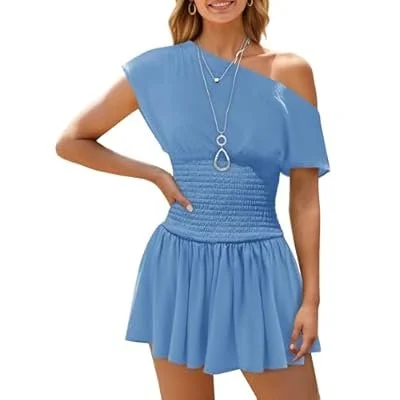 Wenrine Women's Off The Shoulder Mini Dress Summer Short Sleeve Smocked Waist Y2K A Line Going Out Club Dresses